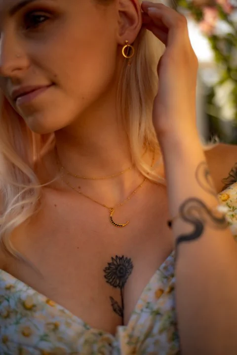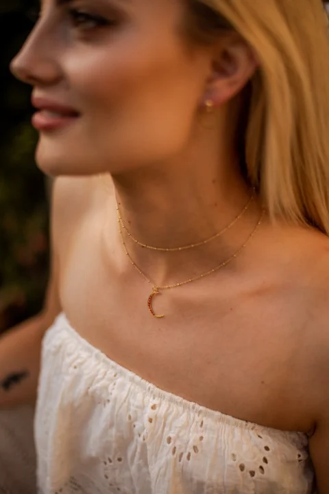 Na zdjęciu modelka ma dwa łańcuszki.