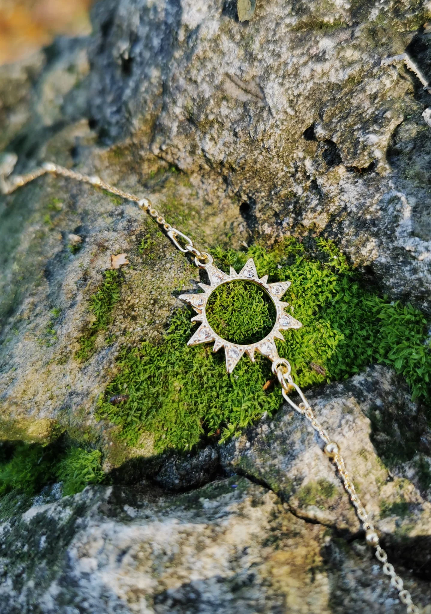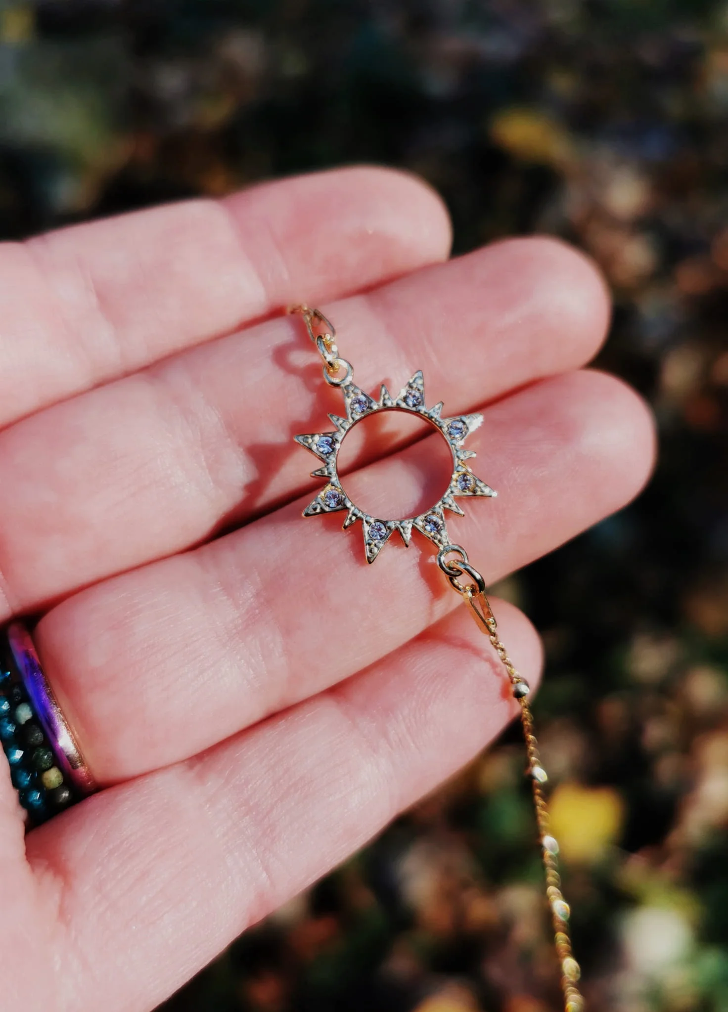 Piękna bransoletka ze słońcem wysadzanym cyrkoniami i dodatkiem jasnobłękitnego akwamarynu.